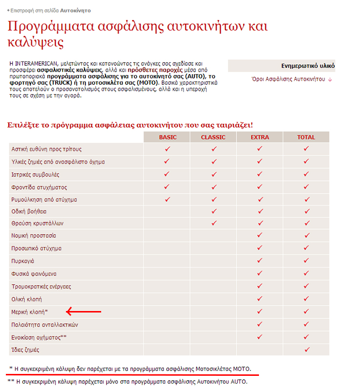 Παρακάτω βλέπετε τον πίνακα από το site της Interamerican που κατέβασα πριν 2 λεπτά, στον οποίο αναγράφεται ξεκάθαρα ότι η κάλυψη ΜΕΡΙΚΗΣ κλοπής ΔΕΝ ισχύει για τα πακέτα ΜΟΤΟ! και επίσης το τελευταίο πακέτο (TOTAL) δεν προσφέρεται για μηχανή.